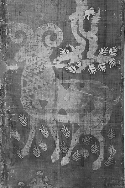 這個屏風高1.63米,染成黃色后上蠟,然后再染紅色,這樣上蠟的部分就形成了圖案:一株大樹下站著一只卷角羊,羊身上有幾何形圖案。這個屏風不光工藝精美,更是古代絲綢之路交流的重要例證。根據屏風上的墨書記錄,這個屏風是751年之后在日本制作的,然而上面的卷角羊原產于伊朗,當時的日本人是不可能見到的,那這個屏風是怎么設計的呢?很顯然,中間的關鍵環節就是中國唐朝。