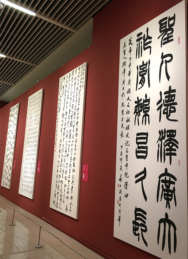 此次展覽主題鮮明、內容豐富,品類齊全、格調高雅,書法家們力圖通過自己的作品,緬懷先賢、謳歌英雄,增強自信、鼓舞士氣。據介紹,中國書協多次邀請中國史學方面的知名學者和研究黨史的權威專家,研討論證,遴選比較,本著代表性與廣泛性相統一、杰出人物與英雄群體相兼顧、歷史價值與時代意義相結合的原則,最終選出100余名代表人物和群體,基本展示出中華民族五千年的發展歷程。書寫內容由組委會從大量歷史文獻中精挑細選,突出民族脊梁的歷史貢獻與精神傳承,人物小傳則由史學專家嚴格審核,尊重史實,數易其稿,反復斟酌。在書家遴選方面,除知名書家外,其中一半作者來自基層。絕大多數作品采用丈二尺寸,風格各異,諸體兼具。大字榜書氣勢磅礴、筆墨淋漓,小字作品行文千言、嚴謹精到,體現了當代書家繼承傳統的堅實功力和精益求精的嶄新面貌。展簽上的民族脊梁傳記全部由當代優秀的中青年小楷書家書寫,簡易的作品說明成為精美的書法小品,與大幅作品相互映襯、相得益彰。