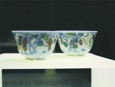 陪葬品雖然不多,但都是精品,其中包括多件明代的斗彩瓷器,如明成化斗彩葡萄紋杯兩件。這兩只小杯外壁繪有葡萄、桑椹等圖案,色彩濃淡得宜,外底寫有“大明成化年制”的楷書款。又如明嘉靖的斗彩折枝花卉八卦紋三足爐,三足爐仿成化斗彩,爐上部繪有八卦圖案,下部繪折枝蓮花紋。這些瓷器在現代價值甚高,即使放在當時也是價值不菲的奢侈品。