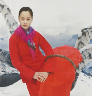 西藏獨特的山水、人物是畫家們畫此不疲的題材,同樣讓中國畫家們孜孜追求的還有農村題材。王沂東的作品《壩上春意》取材于沂蒙山區的風土人情,大雪壓枝低的冬季里,河壩邊顯現出一位身著大紅襖的姑娘,蕭瑟的冬季里乍現的大紅色恰如即將到來的春天帶給人的溫暖之意?!霸跇媹D時我讓樹干、姑娘和籃筐形成了大‘V’字形,然而為了不使畫面構圖過于簡單,我將畫面右邊的枝干做了彎曲處理,破了一下畫面的純‘V’字形。 ”王沂東說。寫實繪畫與觀念藝術存在著天然的不可比性,它自有一套獨立的語言系統,不單單只是客觀地再現,在嚴格的造型基礎上,更需要對輪廓線的處理、結構的認知與強化、空間與解剖的結合、色層與色彩配合、筆觸肌理與質感的烘托等等有著精準的把握?!肮媚锊弊由系膰?,中間那一角的藍色是我刻意加上去的,原來并不是這樣,因為在大片的紅色中需要這樣一個顏色來進行對比,對整幅畫來說也是點睛之處。 ”在他筆下,沂蒙山區的一情一景、一人一物看似簡潔,簡潔中卻蘊藏著豐富的審美構思與藝術底蘊。