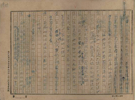 整篇手稿用藍色鋼筆寫在20×20的方格稿紙上,稿紙紙張粗糲,與我們對戰時重慶的物資供給情況的想象一致。整本手稿共計215頁,有修改痕跡。修改明顯可以分成前期和后期兩個階段,以藍色與黑色字跡相區分。陽翰笙的筆跡稍顯潦草,顯出為創作激情驅使而奮筆疾書的戰斗狀態。