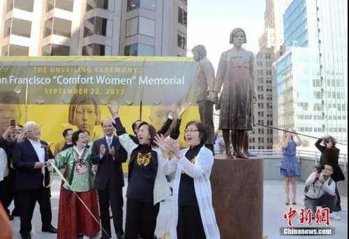 9月22日,在舊金山市圣瑪麗廣場,慰安婦雕像揭幕儀式隆重舉行,這是美國主要大城市第一座慰安婦雕像,雕像以中國、韓國和菲律賓三名年輕女子手拉手的形象為主體,代表當年的慰安婦,旁邊還有一名老婦在仰望,代表健在的慰安婦,碑文內容為,“在1931年至1945年間,13個亞太國家的女性成為日軍的性奴,此碑見證了成千上萬被稱作‘慰安婦’的婦女和女孩?!钡裣裼僧數厝A裔、韓裔為主的民間團體“慰安婦正義同盟”募資并推動落成。