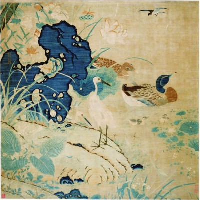 朱克柔 《緙絲蓮塘乳鴨圖》 是現存宋代緙絲畫作中的上乘之作,它出自名家之手,流傳有序,且幅式巨大,絲絲縷縷皆勻稱適宜、層次分明。圖中紅葉白鷺,綠萍翠鳥,蜻蜓草蟲,雙鴨游樂,畫面生動活潑,色彩富有變化。青石處有緙織隸書小款“江東朱剛制 蓮塘乳鴨圖”,下有“克柔”印一方。