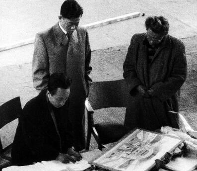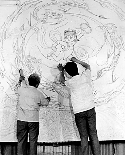 1979年張仃(左)在首都機場壁畫《哪吒鬧?!防L制現場。資料圖片