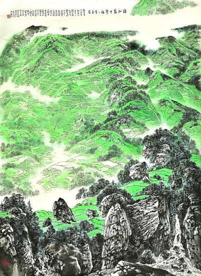 孫君良的中國畫《誰知盤中餐 粒粒皆辛苦》描繪的是黔中山野梯田。風格上看仍是清新遠逸的園林山水,但畫家細細描繪一層一層的梯田,無論筆法還是題跋中,都飽含對人民生活的深情、對山水新貌的關注。