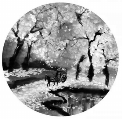 一幅水墨畫的背后“暗藏”詩句:漫天落花似流水,輕車馬騎穿林過,正是“縱被春風吹作雪,絕勝南陌碾成塵”的寫照。選自林帝浣創作的《中國詩詞大會》背景圖。