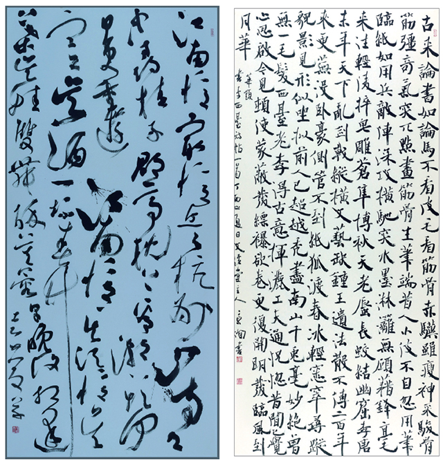 自2011年起,“沈門七子書法展”已分別在滕州、北京、南京、濟南、成都、張掖等地舉辦了六屆,此次展覽是第七屆。七年來,“沈門七子”在沈鵬“弘揚原創、尊重個性、書內書外、藝道并進”16字方針指引下,嚴格遵從其教學理念,深挖傳統,植根經典,相互切磋,取長補短,取得了顯著成績。他們的作品傳統功力深厚,藝術感染力強,既有傳統筆墨語言,又有鮮明的現代氣息。其筆法運用的熟練度、線條墨色的表現力、章法構圖的掌控力,使作品具有強烈的畫面感和震撼力。同時,他們繼承古人又異于古人,形成了各自富有特色的面貌和藝術語言:王厚祥的大草縱橫馳騁,揮灑自由,線質蒼茫,千姿百態;劉京聞筆意線質古樸厚重,欹正變化,疏密相間;龍開勝五種書體均有很好表現,楷行尤佳,結字凝練平和,不激不勵,風規自遠;周劍初五體兼習,大字雄渾蒼茫,小字險峻耐品,古拙瀟灑;李明大字楷書線質老到、結字開張,小楷沉著痛快、疏密得當,行書悠然自得;張志慶的大字行草線質蒼茫老辣、章法疏密相間,小字行草溫文爾雅;方建光深得“二王”意韻,用筆自然,變化豐富,又參以米意,結字奇崛,耐人尋味。他們通過多次展覽,與各地書法家形成了良好互動,不僅廣受關注,并收獲了許多寶貴的經驗和建議,使其在藝術上不斷取得進步。