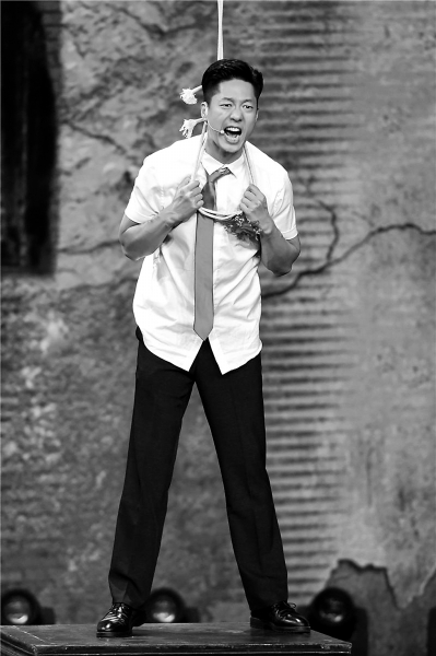 另一段則是凌瀟肅沖上桌子準備上吊時,吼起了那段關中民謠:“他大舅他二舅都是他舅,高桌子低板凳都是木頭,金疙瘩銀疙瘩還嫌不夠,天在上地在下你娃甭牛?!绷铻t肅透露,這是原劇本中沒有的,也是他自己加入的“神來之筆”。他說,在排練前他專門看了一遍《最愛》電影,片中郭富城演這場上吊戲的時候很寫實,但在轉換成戲劇演出時,從床邊快步走上桌子,再拉著繩子上吊,整個過程沒有對話,他覺得太干了,太浪費這個距離了,只憑借肢體動作也根本表現不出人物這時候的心情。于是他想到了在演《關中匪事》時經常哼唱的這首歌謠,頓時覺得非常合適。