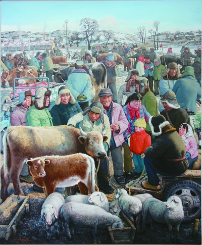“歷史之思”板塊集中了描繪歷史事件、典故,表現文明史、近代史、革命史等方面的造型藝術作品,凝聚了四川美術學院建立以來的歷史意識、歷史情結和優良的革命文化傳統,《秋收起義》《鐵軍東進》《日出東方》《彝海結盟》《紅日》《云嶺的懷念》等作品讓人印象深刻,其中一些作品在寫實歷史人物、事件的同時,融入了美術家對于構圖或是色調的巧思,力求營造出歷史的厚重感和年代感?!艾F實之境”板塊呈現了扎根當代生活,反映當下現實,作出時代思考的造型藝術作品,如描繪奧運瞬間的作品《烈日下·北京2008》、展現抗震救災場面的作品《萬眾一心》、反映城鄉變遷的作品《野草灘的牛羊集市》等,其中,油畫《野草灘的牛羊集市》集風景、人物、動物、靜物等自然界的物象于一畫,以宏大的敘事場面對中國北方農村的生活習俗進行詩意化表達,充滿濃郁的生活氣息。作為第三板塊的“語言之象”為觀者展示了深入體現造型藝術及造型語言、語匯拓展的創作,《大舞臺》中夸張的人物造型強調了畫面的幾何構成和詼諧氛圍,《記憶與夢想》用新穎的畫面布局描繪航天成就,打破了空間與時間的界限,營造出富有當代意味的畫面圖式,《雪夜山影》則充分利用材質的特殊質感,演繹出磅礴與精微間的平衡之美。