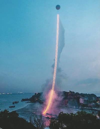 ▲中國四大發明之一的火藥,用到藝術中,可以有怎樣的呈現?蔡國強一直在用爆破、焰火探索著當代藝術的邊界。2015年,在家鄉泉州的一個小島上,用最熟悉的方式,蔡國強點燃了一根小火柴。緊接著,一座500米高的金色焰火的“天梯”拔地而起,與無垠宇宙對話。去年9月上映的紀錄片《天梯:蔡國強的藝術》記錄了背后的一切。(蔡國強工作室供圖)