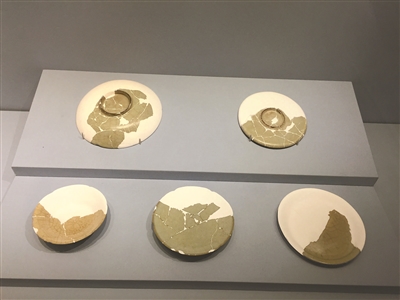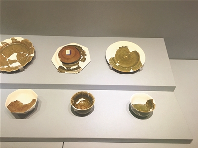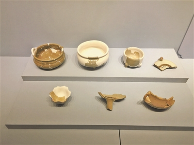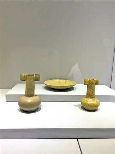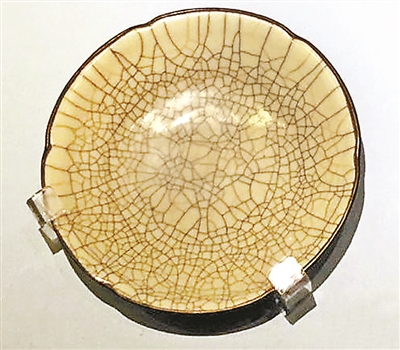 然而若細觀展覽中故宮博物院所藏哥窯瓷器,或可發現,器物釉色以米黃者居多(圖二),幾乎未見粉青,外觀特征令人生疑。由于文獻中哥窯出自龍泉窯一脈,因此有學者將龍泉地區的一種黑胎青瓷視為哥窯瓷器,并對博物館中所藏傳世哥窯瓷器和出土龍泉黑胎青瓷進行了科技分析??萍挤治鼋Y果顯示,這些傳世哥窯與龍泉黑胎青瓷成分差別較大,似并非真正產自龍泉哥窯的產品,倒更有可能是其他地區仿哥窯的產品。