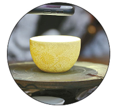 一名海外華文教育學校校長用手機拍攝精美的景德鎮瓷器 光明圖片/視覺中國