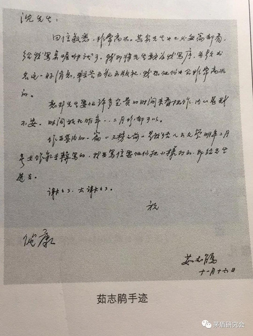 (來源于:《塵封的記憶——茅盾友朋手札》上海圖書館中國文化名人手稿館編 文匯出版社2004年)