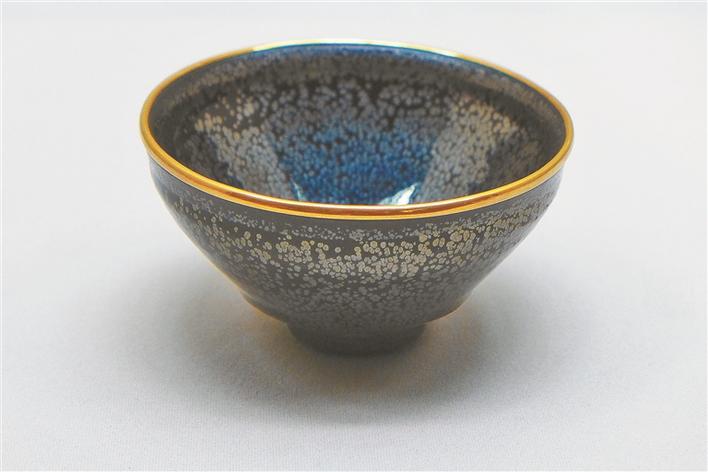 大阪市立東洋陶瓷美術館收藏的宋代建窯“油滴天目”。據說是豐臣秀吉養子豐臣秀次用過的茶碗。