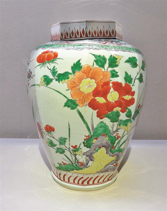 佐賀誕生的“有田燒”,最具代表性的是酒井田喜三衛門的“柿右衛門”赤繪。初代“柿右衛門”由來說法不一。有說,因作品使用了柿色,而獲“柿右衛門”之稱;另說,因為用瓷盤裝柿子獻給藩主,獲賜“柿右衛門”之號。赤繪技術據說是從長崎海商那里得到的。即在陶瓷之器面上,涂以釉藥,燒至攝氏千度以上,產生柔和的白色“濁手”后,再以各種顏色之釉,繪于器面,再改用低溫燒之,產生赤繪之瓷?!笆劣倚l門”除了赤色之外,還使用綠、黃、紫、青之色釉,亦有用金銀者,稱“錦手”或“金襕手”。這種誕生于1644年的赤繪,后來成為“有田燒”的標志。初代“柿右衛門”的作品,如今只能在大阪市立東洋陶瓷美術館這樣的博物館中才能見到,如眼前這兩件“赤繪草花紋瓶”、“五彩牡丹椿紋八角瓶”。