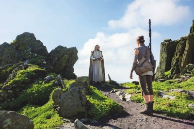 《星球大戰8》頻繁利用“造型”強化人物和空間的關系。盧克所在的小島是全片唯一被陽光照亮的空間,嶙峋的礁石和翻滾的海洋襯托著人物的行動和心境,島上自然光線的變化和人物的成長、取舍、犧牲等戲劇行為之間,產生強烈的隱喻關系。這種“光影”和“戲劇”高度契合的視覺風格,是默片時代的遺產。