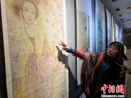 澳門女畫家潘錦玲介紹自己的作品 索有為 攝