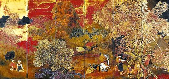 至20世紀30年代后期,阮嘉智、陳文謹、黎國祿等漆畫家在越南美術界聲譽鵲起,越南現代漆畫史上具有奠基意義的作品接連問世。例如,越南美術館收藏著阮嘉智創作于1939年的漆畫屏風《花苑》?!斑@套屏風由八扇木胎構成,一面為風景,繪有芭蕉樹叢等各種花草樹木;另一面為人物,刻畫了一群嬉戲于花間的少女。阮嘉智的重要性在于,他使用了銀白、橙黃、天藍、青綠等色彩,豐富了原來只有紅、黑、金的漆色。另外,他也在蛋殼鑲嵌技術上做了大量嘗試,而且效果斐然?!?/p>