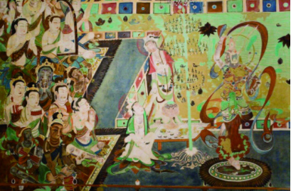我非??春米隼L本的前景,絲綢之路上從古至今的故事就非常之多。多年前我寫的《敦煌遺夢》,便是一套極好的繪本素材。因為敦煌壁畫本身就融和了古波斯、古印度、日本浮士繪的技法,那造型優美的蓮花和飛天藻井,輪狀花蕊的復蓮,流動的飛云,旋轉的散花,飄舞的長巾,艷麗的葡萄、卷草紋,那云氣動蕩、衣袂飄飛的伎樂天……那許多的佛本生、佛傳與經變的故事,那無數的飛天、藥叉、雨師、伎樂、羽人、婆藪仙、帝釋、梵天、菩薩、天龍八部,還有那奇異的鳴沙山、月牙泉、三危佛光……我在書中提到的“吉祥天女沐浴圖”,畫作便來自新疆和田丹丹的石窟——挖掘中國古風做繪本,是一條非常寬廣的跨界寫作之路。