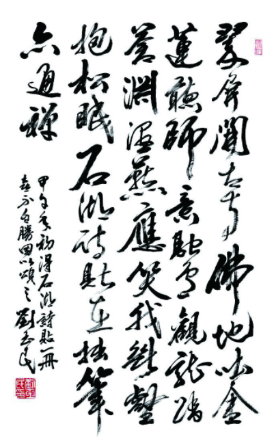 文人書法特別推重內容的原創性,把文學與書法的珠聯璧合、相得益彰,視為既定的目標和要求。從王羲之的《蘭亭集序》到杜牧的《蘇小小詩帖》、蘇軾的《黃州寒食帖》、鄭板橋的《題竹石詩》等無不如此。劉玉民以長篇小說知名,但他同時創作和發表了不少古體詩詞,其中《題畫詩》《自度曲六首》《石湖詩貼頌》《重游百脈泉》等,都成了他書法創作的題材和成果。
