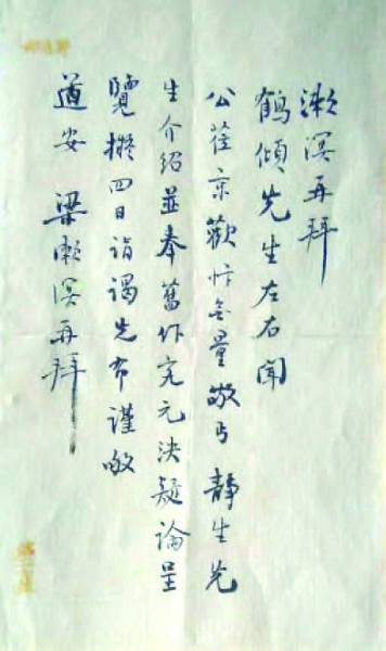 漱溟拜靜生總長閣下:邇聞蔡鶴傾先生蒞京,未審寓居何所。元年嘗一晤于國務院,恐不省憶矣。茲思詣談,敬丐公一緘作介,并希示知寓址,為感。小事干冒,悚愧無量。伏問政祺。梁漱溟再拜(1916年)