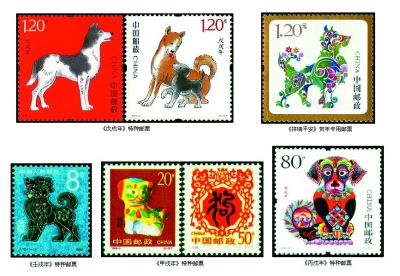 我國第一輪生肖郵票的“狗票”是1982年1月5日的《壬戌年》特種郵票,全套1枚,圖案是側著身子昂首卷尾的一只裝飾畫狗;第二輪生肖郵票的“狗票”是1994年1月5日的《甲戌年》特種郵票,全套2枚,第一枚“平安家?!?,圖案是側身回首的一只五彩泥塑玩具狗,第二枚“祥瑞興旺”,是剪紙“雙狗圖”,中間一篆書“狗”字;第三輪生肖郵票的“狗票”是2006年1月5日的《丙戌年》特種郵票,全套1枚,圖案是身著彩衣、前足并立、后足曲臥、卷起尾巴、目視前方的一只裝飾畫狗。另外2017年10月9日,中國郵政發行一枚《祥瑞平安》賀年專用郵票,圖案為各種花草組合成五彩繽紛的一只狗。這枚賀年“狗票”與《戊戌年》生肖“狗票”有異曲同工之妙。