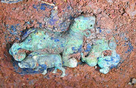 李存信介紹說,現階段清理出的馬蹄金共兩塊,分別位于墓主身側,體量較小,正好可供孩童握在手中。青銅小罐不足十公分,推測是用來盛放水或者砂石進行玩耍的。還清理出一個裝著4件微型青銅獸的盒子,盒子已破損嚴重,青銅獸分別為虎、大角羊、野豬、綿羊;其中虎型青銅獸疑似為漢代玩具車,虎爪下有輪,虎脖子下方有孔可穿繩,可供人力牽引。