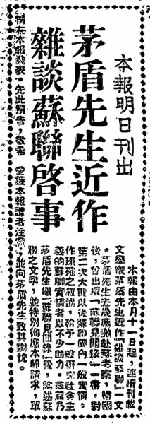本報由本月十一日起,陸續刊載文學家茅盾先生近作《雜談蘇聯》一文。茅盾先生去歲應邀赴蘇聯考察,歸國后,曾出版《蘇聯見聞錄》一書,對第二次大戰以后蘇聯國內一般實情,作翔確之敘述,給予一般研究社會主義的蘇聯實情者以不少助力。茲篇乃茅盾先生繼《蘇聯見聞錄》后,論述蘇聯之文字,并特別循應本報請求,單獨在本報發表。先此預告,敬希愛護本報讀者注意,并向茅盾先生致其謝忱。