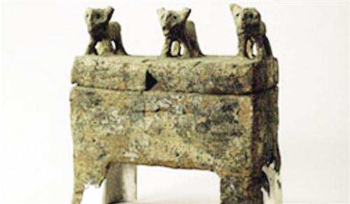 而現藏于甘肅省博物館的四壩文化三狗紐蓋彩陶方鼎器蓋上的三只狗卻完全體現出了不同的氣勢。它們四肢直立,昂頭翹尾,姿態生動而逼真,顯示出一種進攻和拱衛的姿態。這或許與當地的民風相關,三只狗傲然的姿態不由讓人聯想,它們的主人又是何等風采?