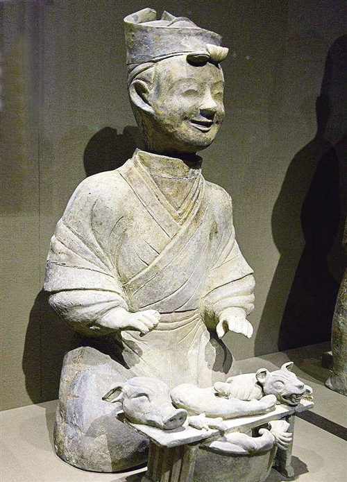 出土于天府之國四川的漢代庖廚俑的案頭擺放著一只“食狗”。作為原始部落的主要食物之一,狗最初是作肉用的?!抖Y記·曲禮》有云“凡祭宗廟之禮……雞曰翰音,犬曰羹獻?!睋吨芏Y·天官》記載,當時狗肉已是美味的“六膳”(牛、羊、豕、犬、雁、魚)之一。
