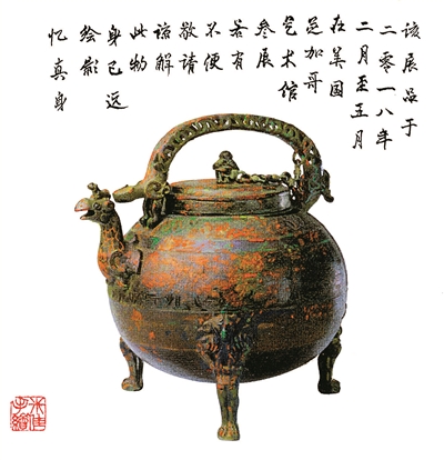 最近,到故宮青銅館參觀的觀眾會發現,有幾個展柜中的文物不見了,取而代之的是一幅幅古色古香、幾可亂真的青銅器畫像。這畫不但可以讓觀眾領略國寶青銅器的風采,旁邊還有幾行小字說明情況,原來展品2018年2月到5月去美國芝加哥藝術館參展,所以特此向觀眾道歉,敬請諒解,而用畫代替展品,是為了“此物身已遠,繪影憶真身”。