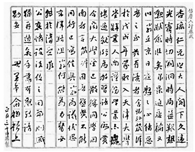 久違光霽, 時切溯洄, 時局益艱, 想勛猷愈壯矣。弟景迫桑榆, 又以小孫在京, 日夜懸懸, 心緒惡劣之至。茲有瀆者, 舍姪孫箴墀于戊戌年蒙取入天津大學堂肄業, 人尚謹飭, 學業不粗, 堪造就, 頗為教習諸公所賞。今聞大學堂已散, 據同學回南者言箴墀因無盤費, 不能同行, 止寫信與小孫商議。伏思京津路阻, 小孫何能為力, 勢必轉于溝壑。承公哀憐, 設法使之回南, 則感猶再造矣。手肅布懇, 敬請勛安。