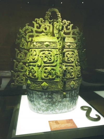 再往前走,看到了一件“秦公鐘”和一件“秦公镈”,均由寶雞青銅器博物館供展。記者查閱相關資料得知,出土時一共有8件銅器,其中鐘5件、镈3件,上面均有銘文。銘文合計135字,據釋文,主要是頌揚秦國先祖的業績。銘文記錄到了秦憲公之時,再結合行文的口吻,學界基本推斷作器者是憲公之子秦武公。武公征服了周邊戎族,使秦國勢力達到關中渭水流域。在鐘和镈旁,各有一個S型的鉤狀物。馬今洪解釋,這個鉤狀物是掛鐘、镈用的。镈敲出的是單音,鐘敲出的是雙音,鐘的敲擊點一個在下方的中心位置,一個在右下側鑄有小鳥圖案的地方?!坝辛穗p音鐘,就可以用數量較少的鐘構成完整的音階了?!瘪R今洪說。