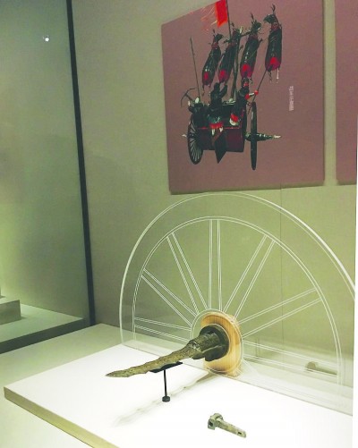 繞到下一個展廳,只見一個模擬的半個戰車車輪的車軸位置,豎插著一把劍似的物件?!斑@就是當年的‘大規模殺傷性武器’?!毙芙ㄈA介紹,這是戰車上的矛狀車軎,1978年出土于湖北隨縣曾侯乙墓。矛狀車軎在使用時,軎轄朝上,矛葉與地面平行,在戰車行進時,可殺傷車旁之敵?!霸趹饑鴷r代,為提高戰斗力和殺傷力,各類兵器與防御裝備都在迅速改進?!?/p>
