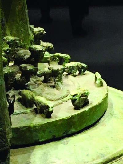 “這個銅盉借調到上海博物館展出時,我曾經仔細看過,非常有意思?!瘪R老師把我們帶到一個中心展柜前,內中展示的是由浙江省博物館送展的“螭紋提梁銅盉”。定睛看器蓋,只覺好似走進了動物園,上面立體地雕塑了犀牛、大象、老虎、熊、鹿等獸類,足有16只。在這些動物四周,堆塑著11條形態似蛇的螭龍,有的正在大快朵頤,有的昂首好似在下咽,有的豎起上身像在尋找獵物?!澳憧?,這條螭龍在吃什么?”見記者似乎迷失在“動物園”中,馬老師靈機一動,掏出手機選好角度“咔嚓”一聲,而后指著手機屏幕道,“就是這條,你看它在吃什么?”熊建華問:“是不是青蛙?蛇吞蛙的主題很常見?!瘪R老師搖搖頭:“你們看,這眼睛瞪得大大的,嘴巴張開,高舉雙手……這是個人,他的腳已經被螭龍吞啦!”聽到這兒,熊建華興奮起來:“你說,這會不會就是 ‘饕餮紋’的立體形象呀?”