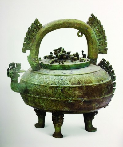 再往前走,一個大玻璃展柜中陳列了一鑒一壺,名為“晉趙簡子用銅鑒、銅壺”。這組器物1988年出土于山西太原金勝村趙卿墓。趙簡子為晉昭公時卿大夫,是戰國時趙國基業的開創者。馬今洪介紹,青銅器的發展基本可分為五個階段:萌生期(夏)、育成期(商代早中期)、鼎盛期(商代晚期、西周早期)、轉變期(西周中晚期、春秋早期)和更新期(春秋中晚期、戰國)。從西周中晚期開始,青銅器逐漸發生變化,“形成了新的禮制制度、新的意識形態”。但在“更新期”,在器形、紋飾方面,青銅器一度出現了“仿古”風潮,這組器物中的鑒,所飾的獸面紋就是“仿古”圖案。在陳列的器物旁,還配有“壺鑒出土時組合使用圖”,圖中,銅壺被放置在銅鑒中。馬今洪說,很可能壺中放酒,鑒中放冰,再將酒壺放入冰鑒中,制作成冰酒。難道古人還要用冰酒陪葬?“講求排場嘛!”馬今洪說,從許多墓葬的線描圖可以看出,墓葬中器物的擺放都是從“活人視角”出發的。