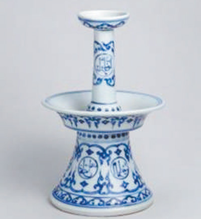 這是一件明正德年間的青花燭臺。燭臺很復雜,由四部分組成,最上端為蠟燭插口,外壁繪如意云頭紋;其下為燭臺細長支柱,中部繪圓形開光,開光內書寫阿拉伯文,上下分別繪勾蓮花枝紋及菱形紋。再下為承托圓盤,也繪如意云頭紋;最下端為喇叭形臺座,也繪圓形開光,開光內書寫阿拉伯文,開光上下分別繪勾蓮花枝紋及菱形紋。燭臺上的阿拉伯文與傳統紋飾,表現出阿拉伯文化與中華傳統文化的交融。