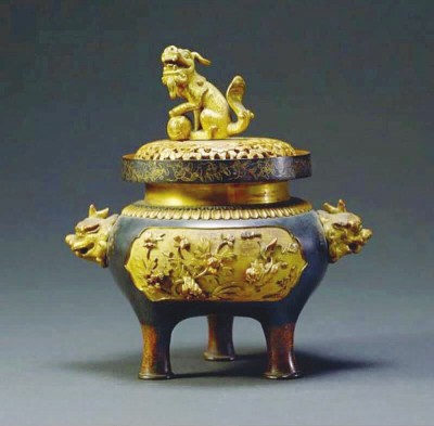 展覽中,年代最早的一件展品是戰國時期的絡紋熏。據考證,這應是一種與熏爐配套使用的熏籠。有記載顯示,早在漢代,熏香已經在貴族中廣泛流行,出現了專門用于熏香的熏爐,以及能直接放在衣物中用來為衣服、被褥熏香的熏籠。唐以后,熏籠的使用更為盛行,詩人白居易 《后宮詞》 中便有“紅顏未老恩先斷,斜倚熏籠坐到明”的詩句。而許多畫家也曾用畫筆描繪閨閣、僧道、文人的用香情景。比如,此次展出的陳洪綬的 《斜倚熏籠圖》 堪稱明代生活用香的經典之作:美麗的女子斜身倚靠熏籠,裙裾招展,熏籠下放置一鴛鴦形香爐。古人不僅以詩書畫詠香,更發揮聰明才智,打造出各式各樣的香具。展出的一件清代的透雕鎏金爐,便是其中的代表。這個香具做工十分精美,蓋頂飾一獅子,蓋面隆起為鏤空的纏枝花紋。這件器物同時運用了錯金和鎏金兩大工藝,器表經過特殊處理呈現三種不同的顏色。蓋底部有款識“造辦處制”,乃是專供內廷和皇家使用的器物。
