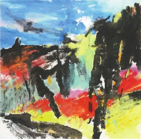 將唐承華的南方韻情系列納入一種風景的框架中似乎有些勉強,但考慮到“一花一世界”的佛家世界觀,我們仍然可以將唐承華極具抽象性的繪畫性表達,視為一種個人化的內心風景加以觀察。唐承華作品中的現實物象,雖有所本,但高度抽象,在強烈而具有書寫性的繪畫表面下,反映出由某些強烈的生活信念所引發的生存的張力。作為版畫畫家的唐承華,他的繪畫,總是堆積著厚重的色彩,在與濃重的墨色相互沖擊生發,一派霸悍沉郁之氣,卻又勾勒出明亮的輪廓,讓人體驗到一種動感。對于唐承華來說,無論他筆下的畫面具有多么詩意的色彩,但其內心,總有一種對現實生活的冷靜思考。