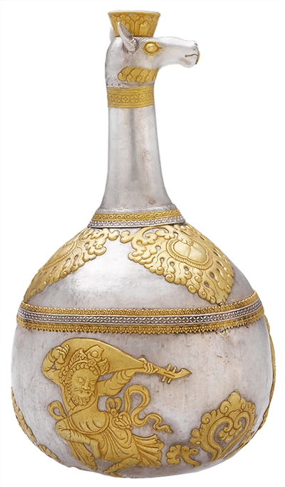 這是存放于大昭寺中的一件珍貴銀器(圖一)。體形巨大,花紋復雜,特別是瓶身雕刻的反彈琵琶形象,讓人很容易聯想起敦煌壁畫中的類似形象,但仔細觀察又有明顯不同,引起不少人的興趣。目前,它還在大昭寺中承擔存放青稞酒的“職責”,所以只能來京一個月,即將載譽回鄉。