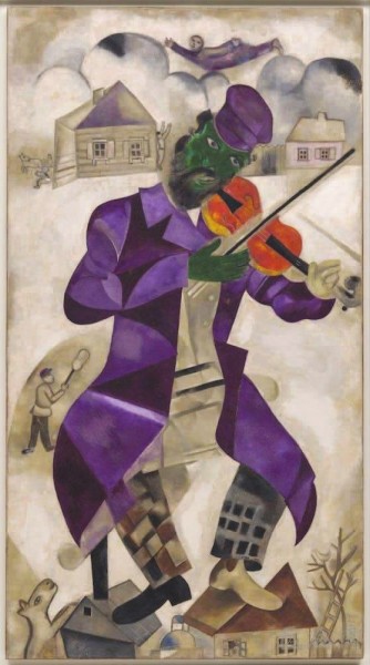 在相當長的時間里,畫家們覺得紫色是一種非常難于處理的顏色,小心翼翼地在作品中避開這個顏色。18世紀末的法國女畫家勒布倫是當時為數不多敢于在畫作中從容使用紫色的畫家。下圖是她的自畫像。直到印象派崛起后,紫色大面積地出現在油畫里。夏加爾則在印象派之后,更有想象力和創造性地發掘了紫色的美感。上圖為夏加爾作品《小提琴家》。