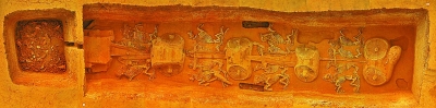 “故郡墓葬的車馬坑最值得一提?!睆埓洪L說,車馬坑在河北省本就罕見,至今發現也不過數座,而要論保存最佳,故郡車馬坑可拔頭籌。五輛車串排的陣列,漆彩貼金的車輿,華美絕倫的絡轡,代表了墓主人的尊貴身份。殉犬帶有項圈銅環,體現了主人對車馬犬的珍視。宏大的規模是墓主人地位、財力和控制力的真實映射?!把橙爽F象和殉牲坑昭示著迥異中原的戎狄風俗?!?/p>