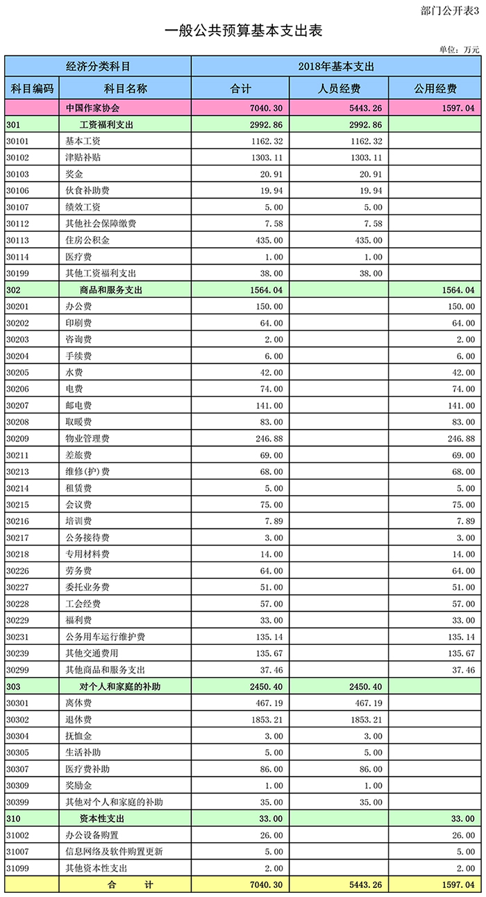 中國作家協會2018 年一般公共預算基本支出 7040.30萬元,其中: