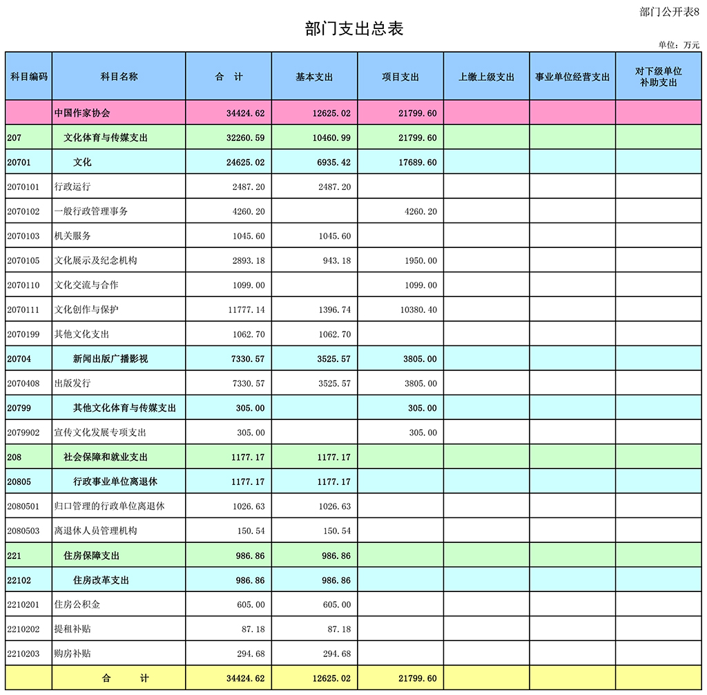 八、文化體育與傳媒(類)文化(款)一般行政管理事務(項):指中國作協本級組織作家深入生活等文學活動所需的項目支出。