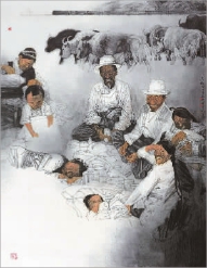感悟羅江的藝術生命,可強烈體會到彝族人家國一體的新時代情懷。他在嫻熟運用黑、白、灰墨色外,還善用褚紅色、蔚藍色、淺綠色、淡黃色,將各種顏色協調有度、變幻無窮,做到新奇而不俗、夸張而不艷,既烘托了中國畫大寫意的風格,又深化了對時代、對生命的敬畏。同時,他注重將新時代主題巧妙融會到藝術生命體系之中,牢牢掌控藝術走向與情趣,給作品賦予深刻熱烈的思想高度,讓每一幅作品都體現出對生活的摯愛、對生命的敬重、對祖國的責任。系列作品《烏蒙山》用豪邁凝練的大寫意手法,描繪不同生活狀態下彝族女人與牲畜的關系,表現出道法自然、天人合一的東方智慧。大型主題創作《誓盟》用細膩深刻的藝術風格,講述云南26個民族代表一心一意聽黨話、跟黨走,為建設平等、自由、幸福的民族大家庭而奮斗的美好故事,體現出了火熱的民族情懷和愛國主義精神,具有厚重的精神內涵和審美價值,也樹立起藝術服務人民、謳歌時代的鮮明導向。