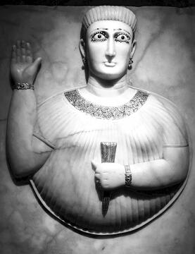 展廳入口處一件掛在墻上的女人半身浮雕石像,將記者帶入世界文明的語境中。這件浮雕是個石碑,來自阿拉伯南部,展現了一名佩戴鑲鍍金珠寶的婦女形象。女人仿佛是從長方形背板上的圓洞中鉆出來的。她抬起右手,掌心向外,左手握著貌似用金子做的一把小麥,專家說這是生育的象征。女人穿著短袖百褶上衣,佩戴精致的金項鏈。她的眼睛特別醒目,不僅用石頭鑲嵌作眼珠,還在其上嵌了黑色的石頭作為瞳孔,睫毛用金屬制成,眉毛也殘留著鑲嵌物。專家說,這可能是一件表現婦女祭司向太陽女神求情場景的陪葬石碑。這種形象的石碑是阿拉伯南部經典的作品風格,倫敦大英博物館有一件與此極為相似的公元一世紀作品。