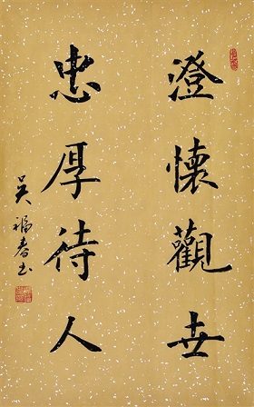 對待傳統楷書,吳福春有著豐富的經驗和純正的承傳,他始終崇奉一個看似笨拙而原始的習書辦法——苦練。出笨力氣,下苦功夫。一個“觀海聽濤”,他可以不厭其煩寫上千遍。有時寫字入神,動不動就練到深夜。這樣嚴謹的為書態度,成就了吳福春中正妍美、浩氣堅質、雄健有力的藝術風骨。有人形容他的作品“于老辣中見骨力,于自如中見俊秀,于童心質樸中見飄逸,其風格奇而不詭,美而不媚,整體諧和,妙趣橫生,整體感覺率真、隨意、干凈、利索、妥貼、自然”。