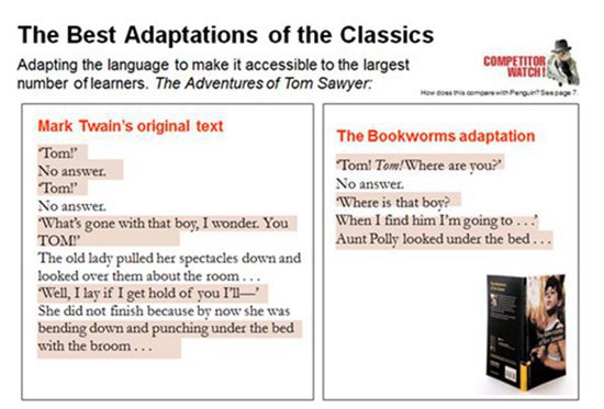 芭斯特強調,重寫經典小說并不僅是簡化語言和縮短長度?!俺晒Φ母膶?,首先要遵守的原則,就是符合原著中作者的原意。所以,必須詳細分析原著,包括其敘事結構、人物描寫、修辭格……之后,改寫者要建立一套全新的敘事結構,遵守‘書蟲’系列各個分級類別的用詞原則,根據原著的核心精神,創建全新的文本?!?/p>