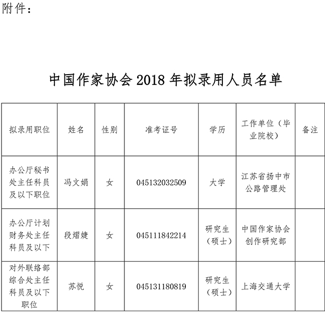 根據2018年度中央機關及其直屬機構考試錄用公務員工作有關要求,經過筆試、面試、體檢和考察等程序,確定馮文娟等3名同志為我會擬錄用人員,現予以公示。公示期間如有問題,請向中國作家協會人事部反映。