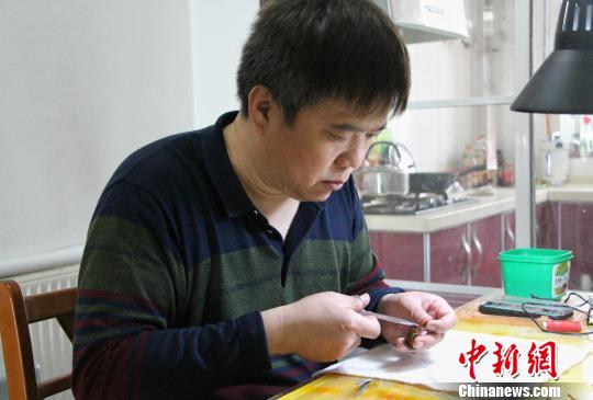 圖為楊鳳巖向記者展示毛猴制作過程?!≮w曉 攝